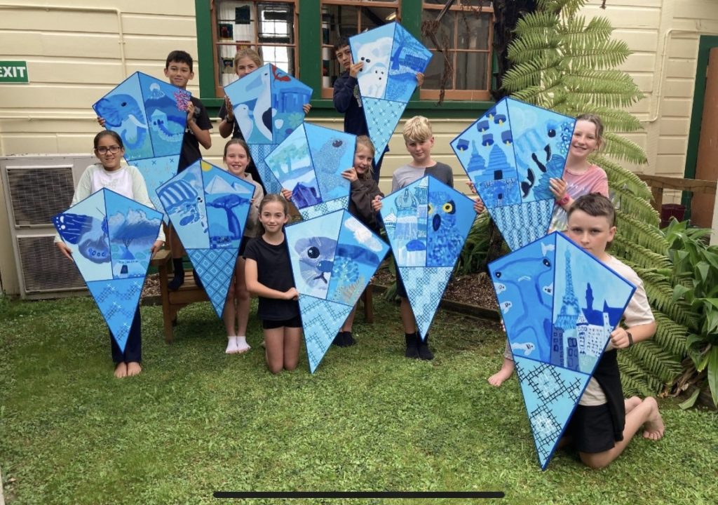 This morning we unveiled our newly completed Year 6 Mural and it looks tino miharo! (beyond amazing!) It is called ‘Ngā Tukutuku O Turitea – The Kites of Turitea.’ Our uara (values) are depicted in the shape of a kite, so Carolyn used this as inspiration for her concept. Each of the ten kites were split into three sections; ngā kararehe (animals), whakapapa (ancestry) and tukutuku (patterning). They worked from a palette of using different shades of blue, since it is our school colour. The thinking behind what went into each of these spaces were very carefully chosen: